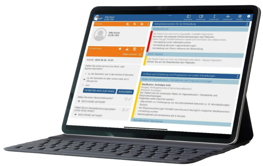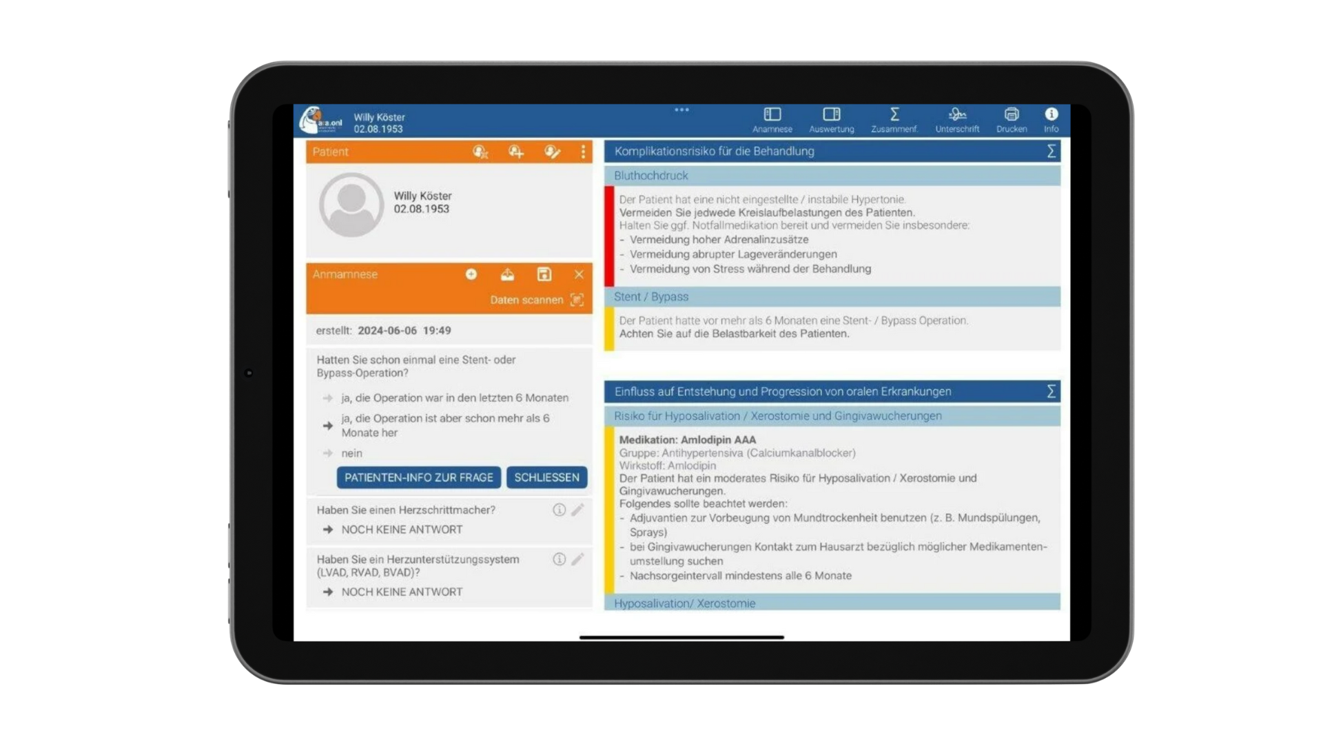 - Der Zahnarzt kann die Anamnese gemeinsam mit dem Patienten besprechen, anpassen und digital signieren.